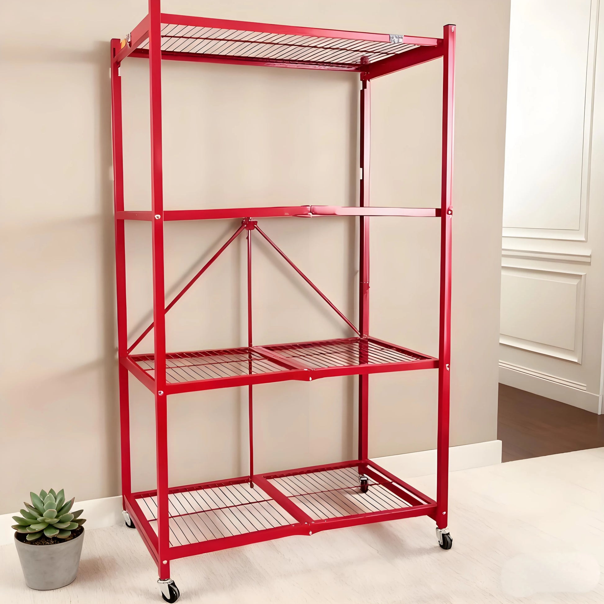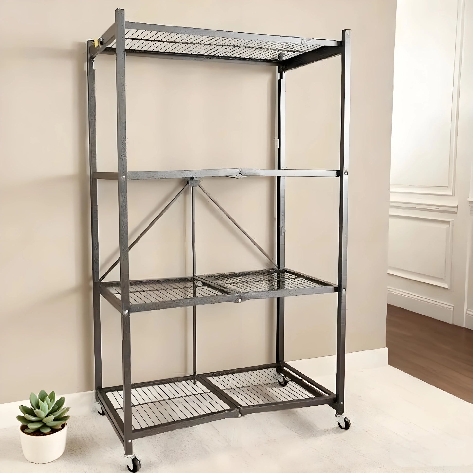 Heavy-duty and smartly made! I’ve moved it from the kitchen to the garage with no issues. The four shelves hold everything securely, and I love how compact it gets when folded.